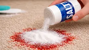 Place ice cubes directly on gum, wax, or syrup stains until hardened. Sprinkle table salt over the area and let it sit for 10–15 minutes. Vacuum and lightly blot with warm water if needed.