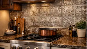Pressed tin backsplashes have that classic, slightly shiny look that reflects light and brightens your kitchen. It’s one of those designs that instantly catches attention without being too loud.