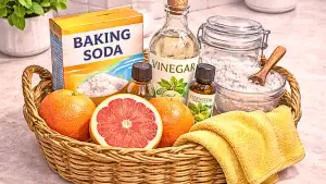 Baking soda lifts odors and stains. White vinegar breaks down grime. Dish soap cuts grease marks. Used together gently, they clean most shoe materials safely.