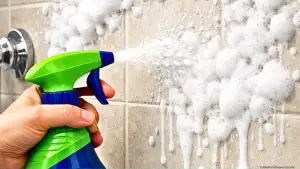 Mix together equal parts baking soda and hydrogen peroxide in a spray bottle. Now spray the shower tiles and let the mixture sit on them for 45 minutes. Now rinse the tiles with warm water.